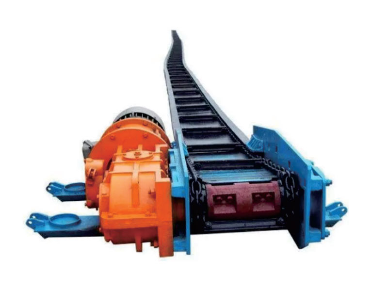 将敞开的溜槽,作为煤炭、研石或物料等的承受件,将刮板固定在链条上(组成刮板链),作为牵引构件。当机头传动部启动后,带动机头轴上的链轮旋转,使刮板链循环运行带动物料沿着溜槽移动,直至到机头部卸载。刮板链绕过链轮作无级闭合循环运行,完成物料的输送。